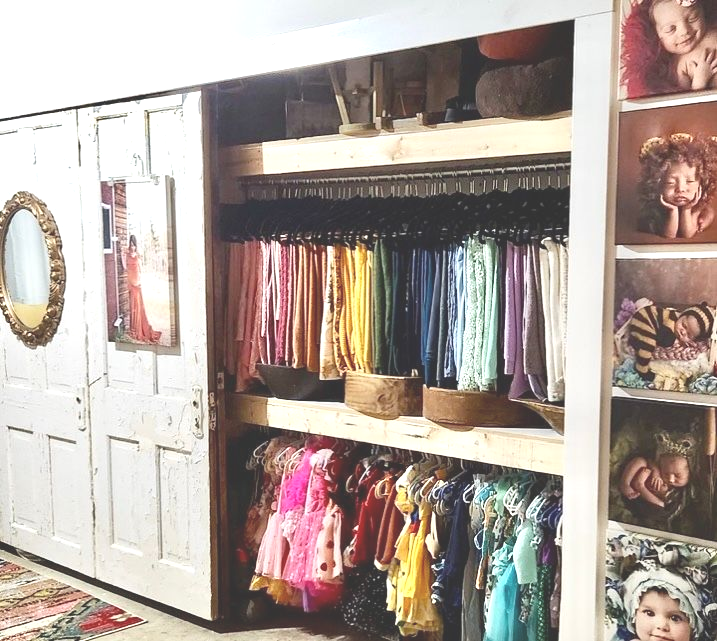A thoughtfully stocked client closet is also available for parents and newborn, offering neutral, soft-toned wardrobe options that photograph beautifully and coordinate seamlessly with your newborn’s session.